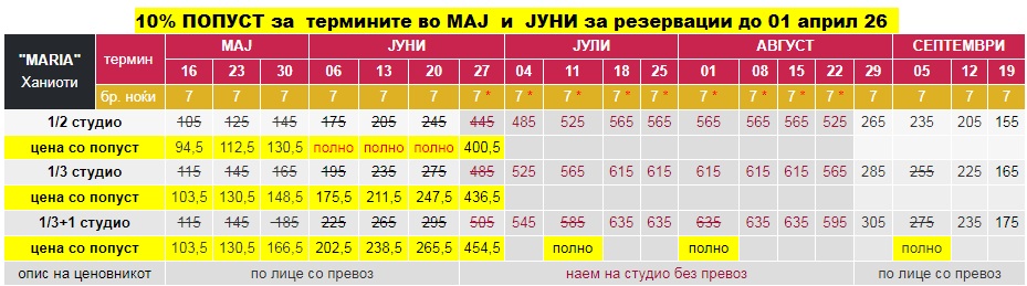 - Цените за 7 ноќи/8 дена со *, се дадени за наем на цело студио без вклучен превоз;
