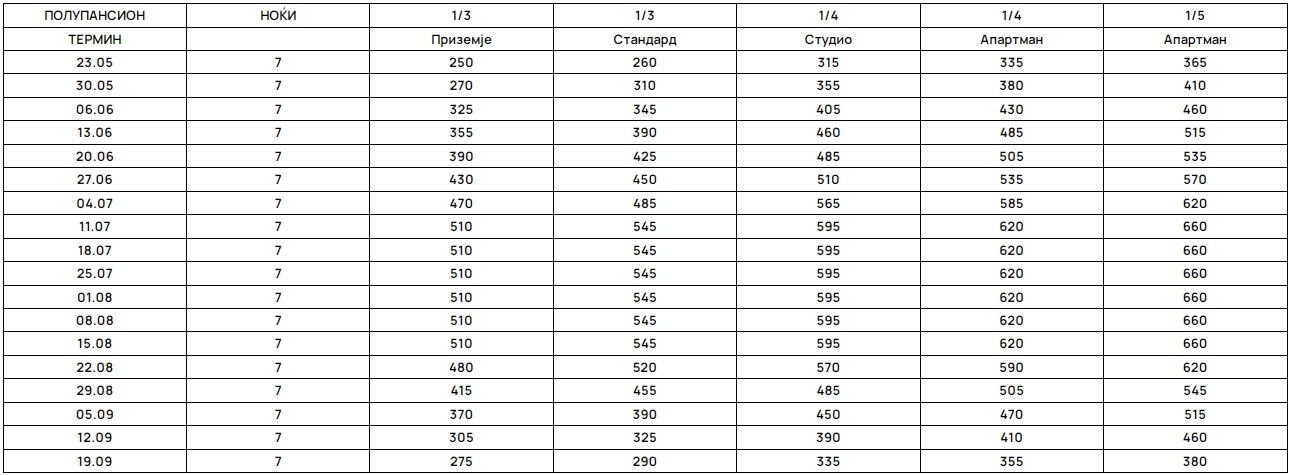 * Цените во табелата се дадени по лице и се однесуваат за услуга ПОЛУПАНСИОН за 7