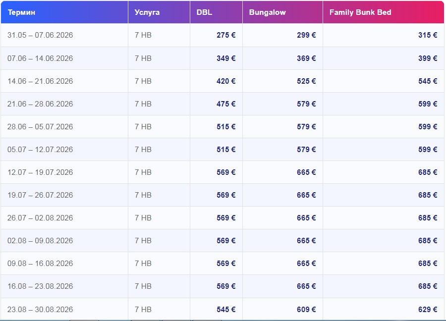 - Bungalow: брачен лежај или две одвоени легла и кревет на спрат или едно дополнително легло. Максимум сместување: 2 возрасни + 2 деца (0–11,99 г.) или 3 возрасни.