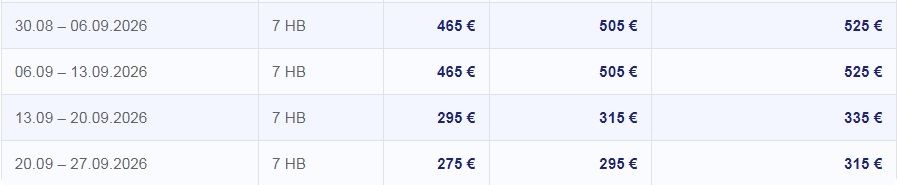 Сите цени се дадени по лице за 7 полупансиона и се изразена во евра, 1 еур = 62 мкд