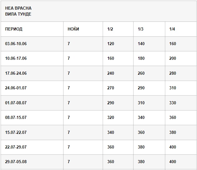Вила ТУНДЕ на 130 – 140 м од плажа 1/2, 1/3 и 1/4 студија(со по два дупли кревети или 1 дупли и два поединечникревети), опремени со: кујна, ТВ, купатило, тераса,WI-FI,клима уред – вклучена во цената.