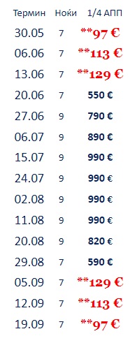 Другите цени во табелата се дадени за наем на студио или апартман за 7 или 9 ноќевања.
