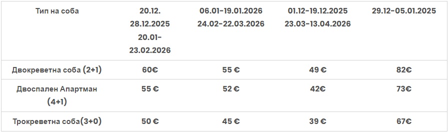 - Прво дете од 5 до 11.99 на допполнително легло во Двоспален апартман со 4 возрасни лица –БЕСПЛАТНО