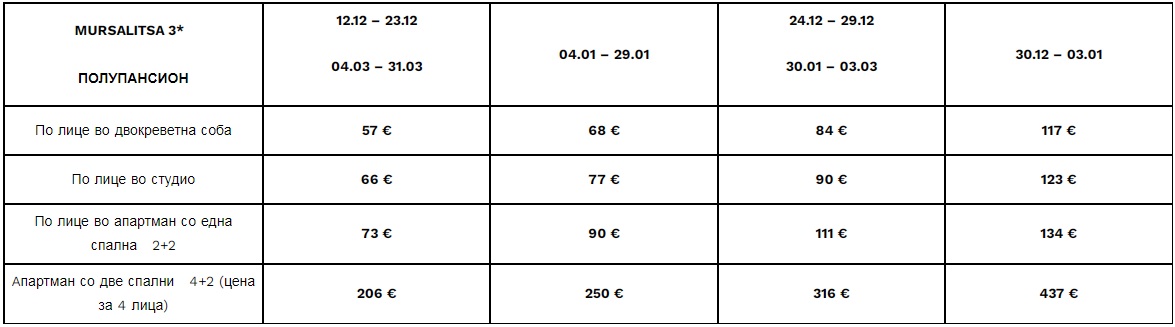 Во цената е вклучено: ноќевање со појадок и вечера по лице на ден ( освен во двоспалниот апартман), користење на внатрешен базен, сауна, парна бања, фитнес, паркинг, интернет, трансфер до гондолата Студенец