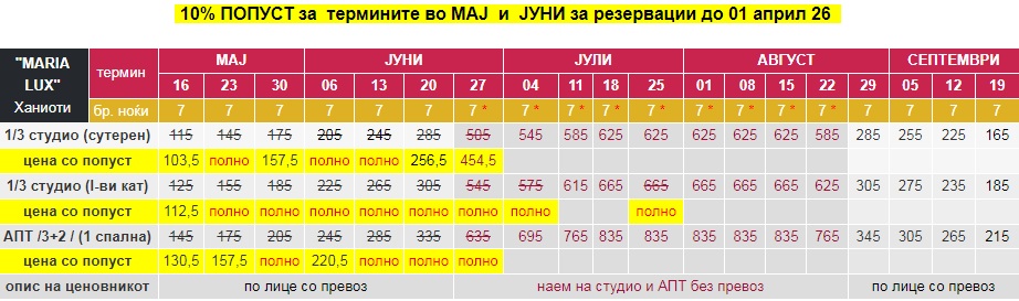 - – Цените за 7 ноќи/8 дена со *, се дадени за наем на цело студио/апартман без вклучен превоз;
