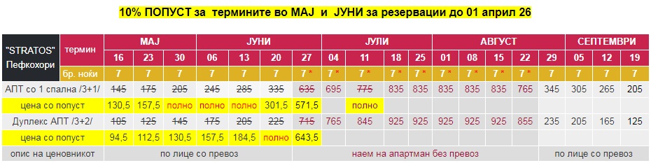 - – Цените за 7 ноќи/8 дена со *, се дадени за наем на цел апартман без вклучен превоз;