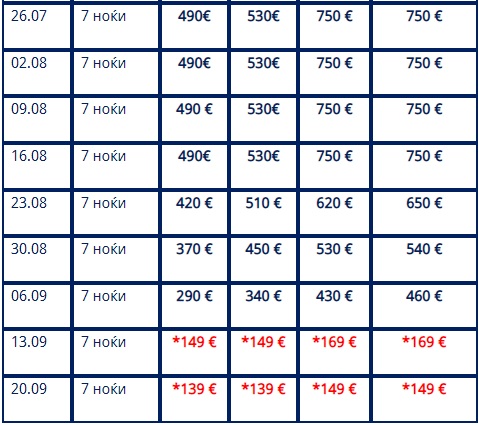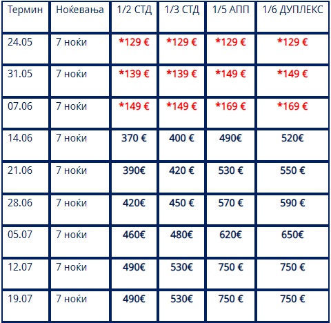 Другите цени во табелата се дадени за наем на студио или апартман за 7 ноќевања.