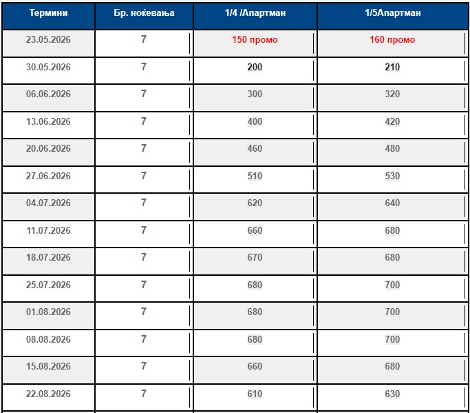 Цените во табелата се за наем на Студио / Апартман за 7 нокевања, и се објавени во евра (1еур=62ден).