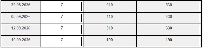 Преземањето на собите започнува најрано во 14 часот по локално време првиот ден, а напуштањето на истите е најдоцна до 9 часот по локално време последниот ден од аранжманот.