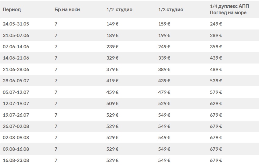 - Дуплекс 1/4 – опремена кујна со трепезарија, две одделни спални соби со по два единечни кревети, бања, два ТВ , два клима уреди и две тераси, едната тераса со директен поглед на море.