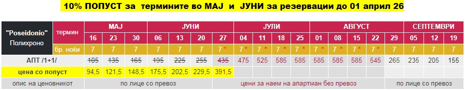 - – Цените за 7 ноќи/8 дена (со *), се дадени за наем на цел апартман без вклучен превоз;