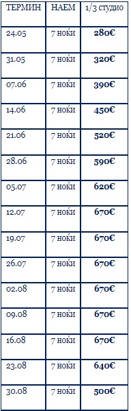 ЦЕНИТЕ во табелата се дадени за наем на студио или апартман за 7 ноќевања.