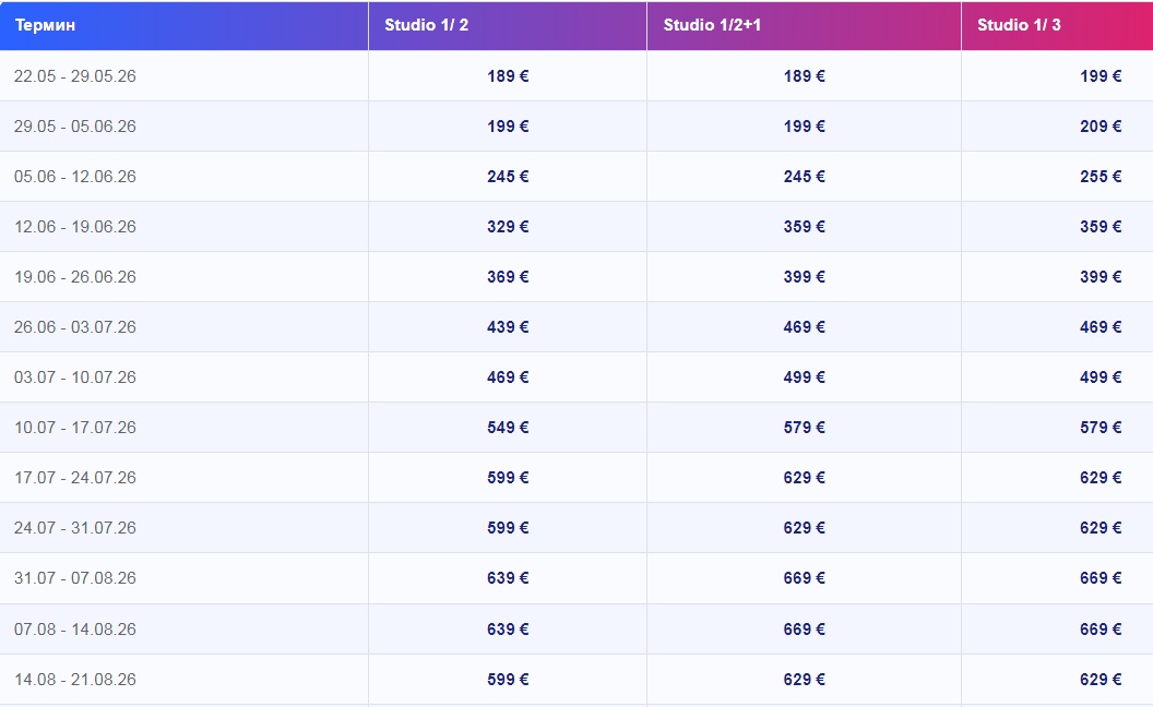 Сите цени се изразена во евра(1еур=62ден) за наем на Студио за 7 нокевања.