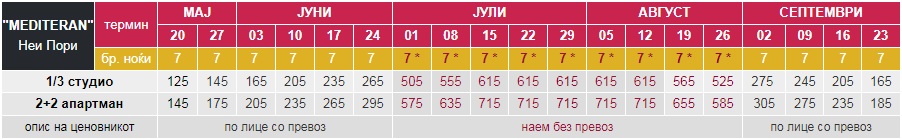 - – За аранжманите за 7 ноќи/8 дена (без *), при патување со сопствен превоз се намалува -10€ од цената по лице (освен за првиот и последниот термин);