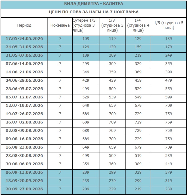 - Цените се за наем на студио за 7 ноќевања (без превоз).