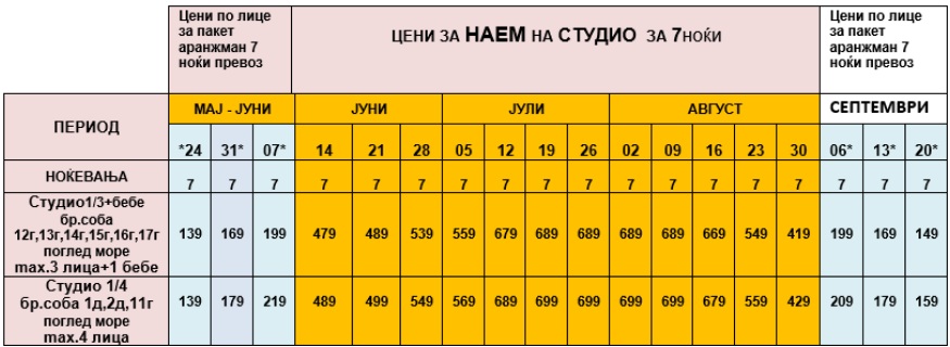ЦЕНИТЕ ОЗНАЧЕНИ СО ЗВЕЗДИЧКА * ВО ТАБЕЛАТА СЕ ПАКЕТ АРАНЖМАНИ И СЕ ДАДЕНИ ПО ЛИЦЕ ЗА 7 НОЌИ СО ВКЛУЧЕН АВТОБУСКИ ПРЕВОЗ.ОСТАНАТИТЕ ЦЕНИ ЗА ДАДЕНИТЕ СМЕНИ СЕ ОДНЕСУВААТ ЗА НАЕМ НА АПАРТМАНИ ЗА 7 НОЌИ.