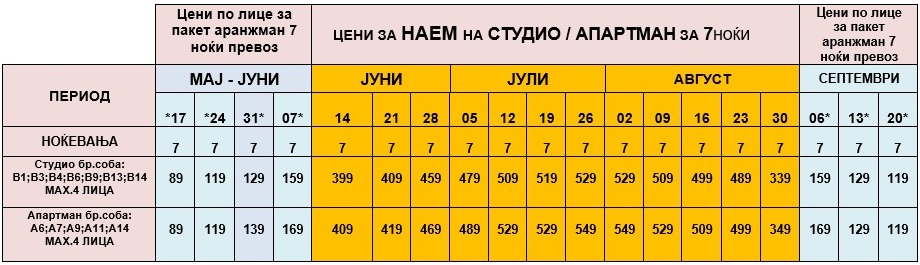 - ЦЕНИТЕ ОЗНАЧЕНИ СО ЗВЕЗДИЧКА * ВО ТАБЕЛАТА СЕ ПАКЕТ АРАНЖМАНИ И СЕ ДАДЕНИ ПО ЛИЦЕ ЗА 7 НОЌИ СО ВКЛУЧЕН АВТОБУСКИ ПРЕВОЗ.ОСТАНАТИТЕ ЦЕНИ ЗА ДАДЕНИТЕ СМЕНИ СЕ ОДНЕСУВААТ ЗА НАЕМ НА АПАРТМАНИ ЗА 7 НОЌИ.