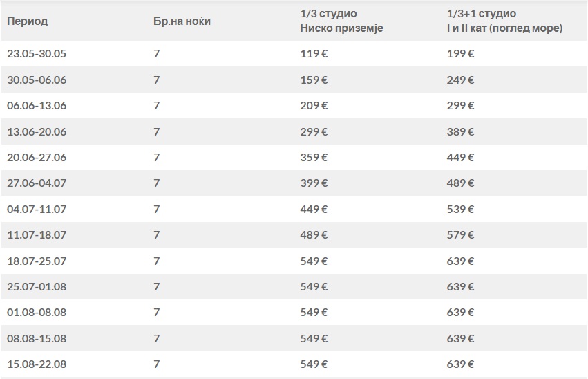 - Студио 1/3– три единечни кревети, опремена кујна, бања, ТВ, тераса.