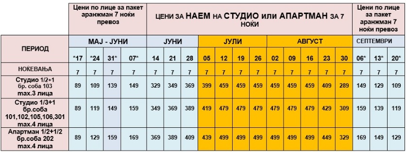 претходно одобрување и “доплата” од 10 евра од ноќ,може да се смести максимум + едно дете (6 години) во кревет со родител.ЦЕНИТЕ ОЗНАЧЕНИ СО ЗВЕЗДИЧКА * ВО ТАБЕЛАТА СЕ ПАКЕТ АРАНЖМАНИ И СЕ ДАДЕНИ ПО ЛИЦЕ ЗА 7 НОЌИ СО ВКЛУЧЕН АВТОБУСКИ ПРЕВОЗ.ОСТАНАТИТЕ ЦЕНИ ЗА ДАДЕНИТЕ СМЕНИ СЕ ОДНЕСУВААТ ЗА НАЕМ НА АПАРТМАНИ ЗА 7 НОЌИ.