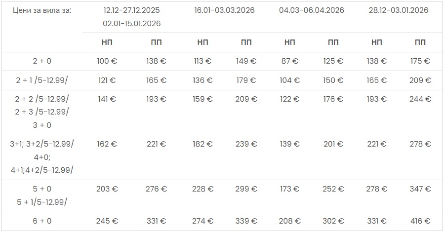 Секоја една вила вклучува пространа дневна соба со софа и мала трпезарија, опремена кујна, тоалет со туш кабина, две спални – една со брачен кревет и една со два еднокреветни кревети, интернет WI FI.