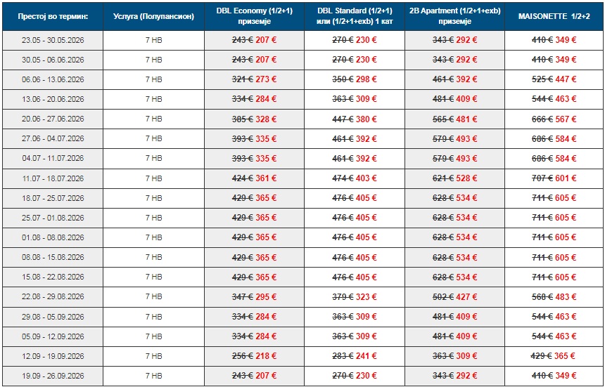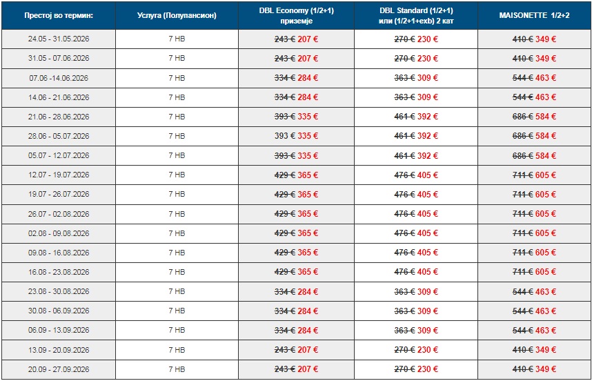 * Сместување во избраниот хотел со услуга по избор според табелите, и тоа 7 полупансиони (појадок и вечера).