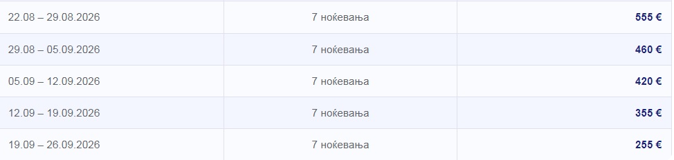 Цените се изразени во евра за наем на студија или апартмани за 7 ноќевања.