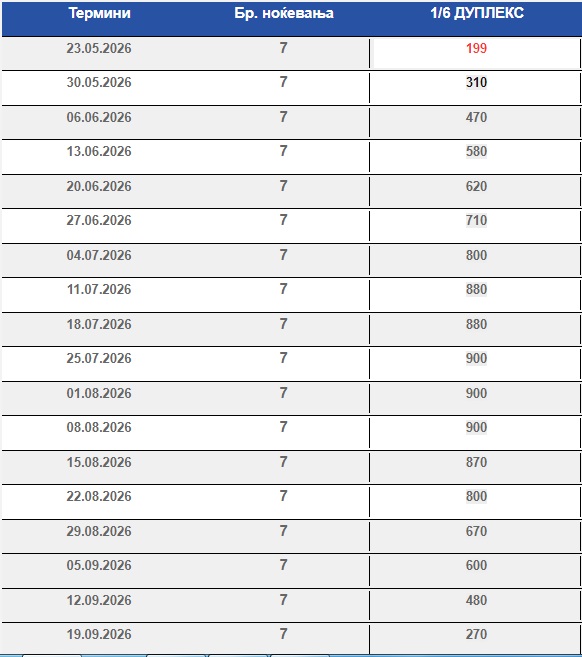 Цените во табелата се за наем на Студио / Апартман за 7 нокевања, и се објавени во евра (1еур=62ден).