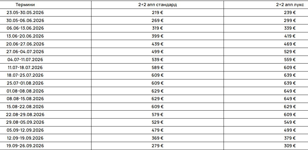 Цените се дадени за наем на Апартман за 7нокевања. Изразени се во евра. 1еур=62ден.