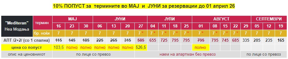 - – Цените за 7 ноќи/8 дена со *, се дадени за наем на цел апартман без вклучен превоз;