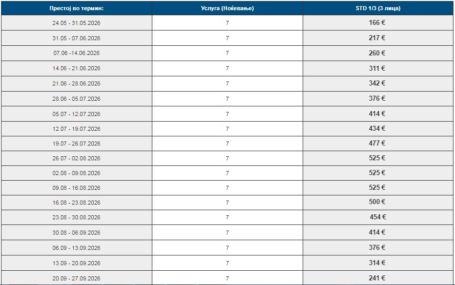 Цените во табелата се однесуваат за наем на студио/апартман за 7 ноќевања (без превоз).
