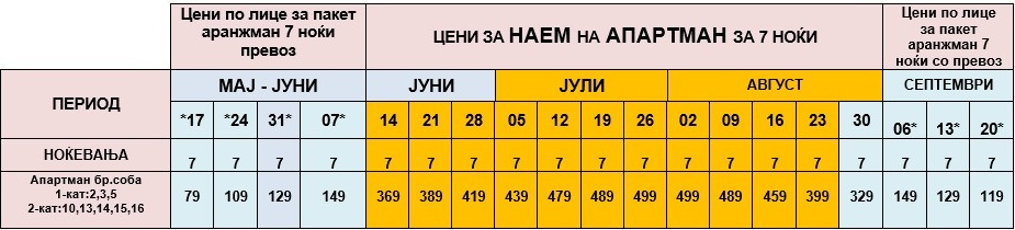 - ЦЕНИТЕ ОЗНАЧЕНИ СО ЗВЕЗДИЧКА * ВО ТАБЕЛАТА СЕ ПАКЕТ АРАНЖМАНИ И СЕ ДАДЕНИ ПО ЛИЦЕ ЗА 7 НОЌИ СО ВКЛУЧЕН АВТОБУСКИ ПРЕВОЗ.ОСТАНАТИТЕ ЦЕНИ ЗА ДАДЕНИТЕ СМЕНИ СЕ ОДНЕСУВААТ ЗА НАЕМ НА АПАРТМАНИ ЗА 7 НОЌИ.