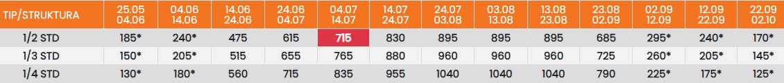 Цените во табелата со (*) се дадени по лице со превоз. За со сопствен превоз се одбива 25еур.