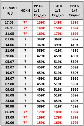 - Вонсезонските цени (со *) се дадени по лице за 7 ноќевања со вклучен автобуски превоз.За пакет аранжман во студио потребни се минимум 2 лица , трето и четврто лице – плаќаат само превоз ако користат, 50 евра За патниците кои нема да користат организиран превоз, од цената се одбива 10 евра по лице .