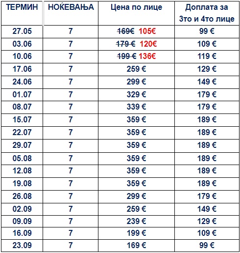 Цените се однесуваат на пакет аранжман по лице за 7 ноќевања со вклучен: