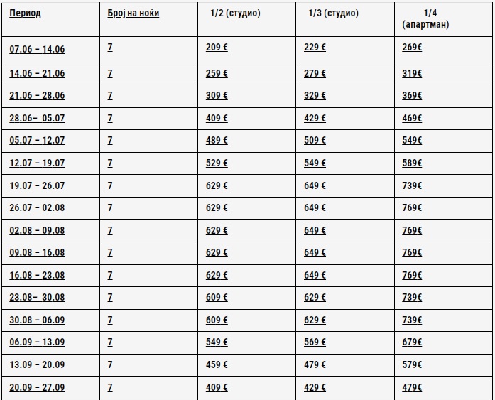 Цените се дадени за наем на студио / апартман за 7 нокевања, и се изразени во евра (1еур=62ден)