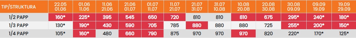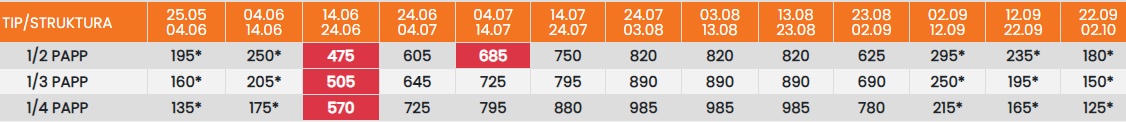 Цените означени со звездичка * се цени по лице за 10 ноки со вклучен превоз, За со сопствен превоз цената се намалува за 25еур по лице.