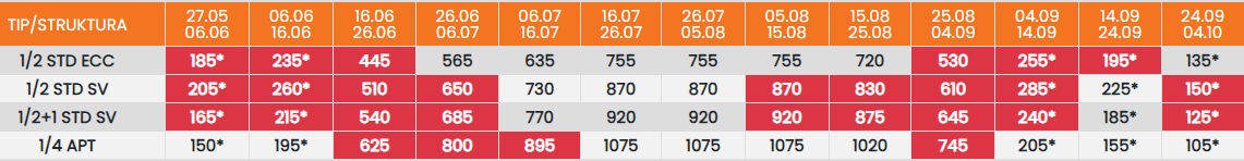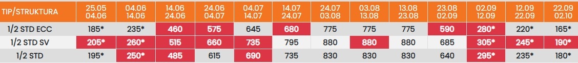 Цените означени со звездичка * се цени по лице за 10 ноки со вклучен превоз, За со сопствен превоз цената се намалува за 25еур по лице.