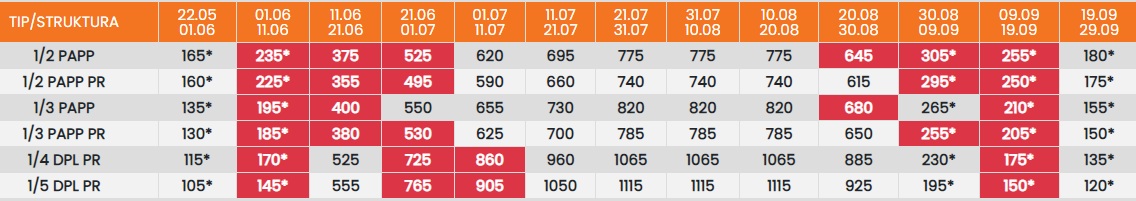 Цените означени со звездичка * се цени по лице за 10 ноки со вклучен превоз, За со сопствен превоз цената се намалува за 25еур по лице.