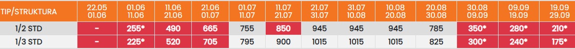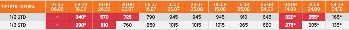 Цените означени со звездичка * се цени по лице за 10 ноки со вклучен превоз, За со сопствен превоз цената се намалува за 25еур по лице.
