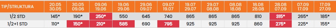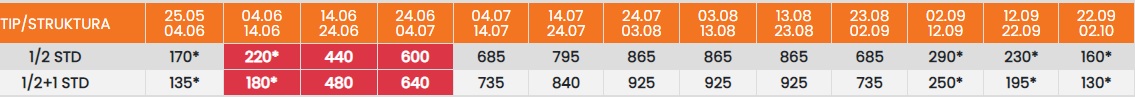 Цените во табелата со (*) се дадени по лице со превоз. За со сопствен превоз се одбива 25еур.