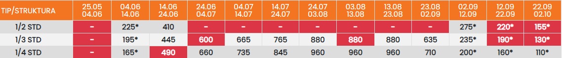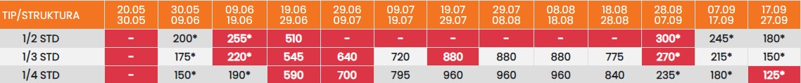 Цените во табелата со (*) се дадени по лице со превоз. За со сопствен превоз се одбива 25еур.