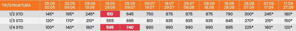 Цените во табелата со (*) се дадени по лице со превоз. За со сопствен превоз се одбива 25еур.