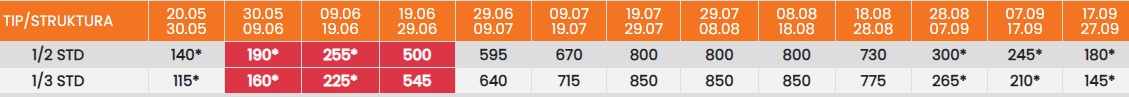 Цените во табелата со (*) се дадени по лице со превоз. За со сопствен превоз се одбива 25еур.