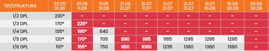 Цените во табелата со (*) се дадени по лице со превоз. За со сопствен превоз се одбива 25еур.