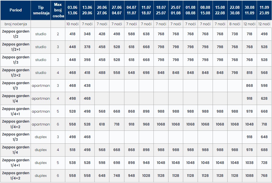 Цените се изразени во евра (1еур=62ден.) и се за наем на Студио / Апп за 9,10 или 12 нокевања.