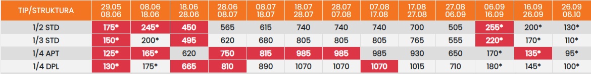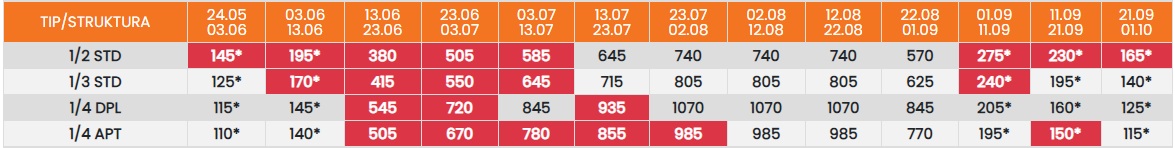Цените во табелата со (*) се дадени по лице со превоз. За со сопствен превоз се одбива 25еур.
