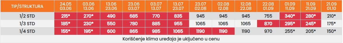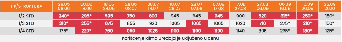 Цените во табелата со (*) се дадени по лице со превоз. За со сопствен превоз се одбива 25еур.