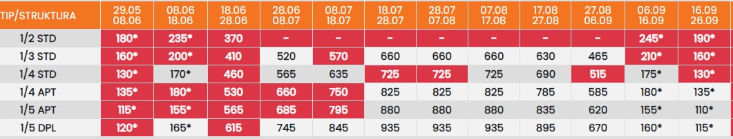 Цените во табелата со (*) се дадени по лице со превоз. За со сопствен превоз се одбива 25еур.