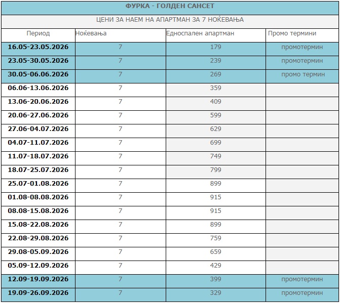 - -Цените се однесуваат на наем на студио за 7 ноќевања (без превоз).