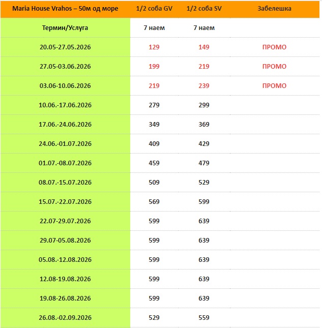 Марија Хаус е сместување на 50 метри од плажата во Врахос. Се состои од уредни двокреветни соби со поглед на море или двор. Покрај добрата локација, нуди приватен паркинг и безжичен интернет. Најблиската пекарница и самопослуга се оддалечени 100 метри. Тие нудат пет климатизирани двокреветни соби (22м2) со еден двоен или два единечни кревети. Собите немаат кујна, само мал фрижидер и основен прибор, но имаат одлично опремена заедничка кујна, која им е на располагање на сите гости на вилата. Имаат ТВ, мрежи против комарци, бања и тераса со поглед на море или двор. Замена на постелнина и крпи, како и чистење, се врши по три ноќевања. Марија Хаус е идеален избор за млади луѓе и парови кои бараат добро сместување на одлична локација.
